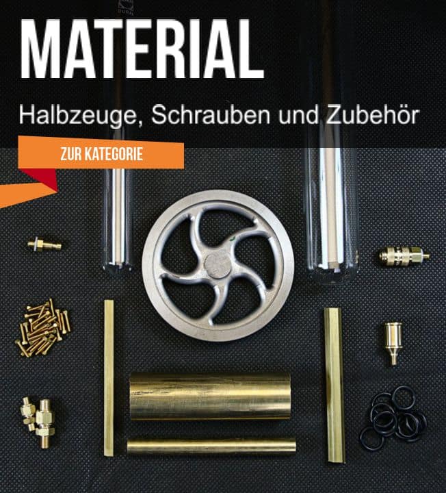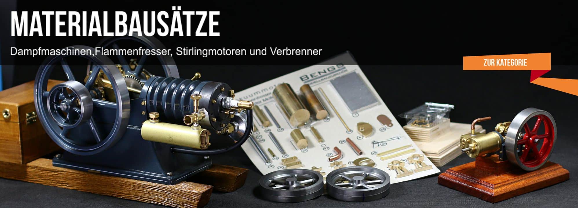 - Materialbausätze: Vorgefräste Materialbausätze von Flammenfresser (Heißluftmotor), Stirlingmotor, Dampfmaschine, Brenner und Verbrennungsmotoren.