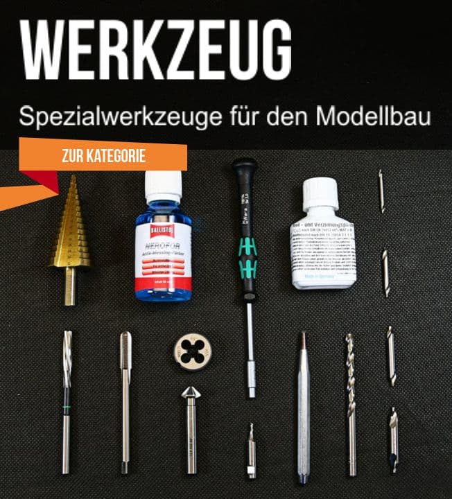 - Werkzeug: Eine attraktive Auswahl an hochwertigen Werkzeugen, Lötzubehör, Schneideisen und Gewindebohrern für den technischen Modellbau.