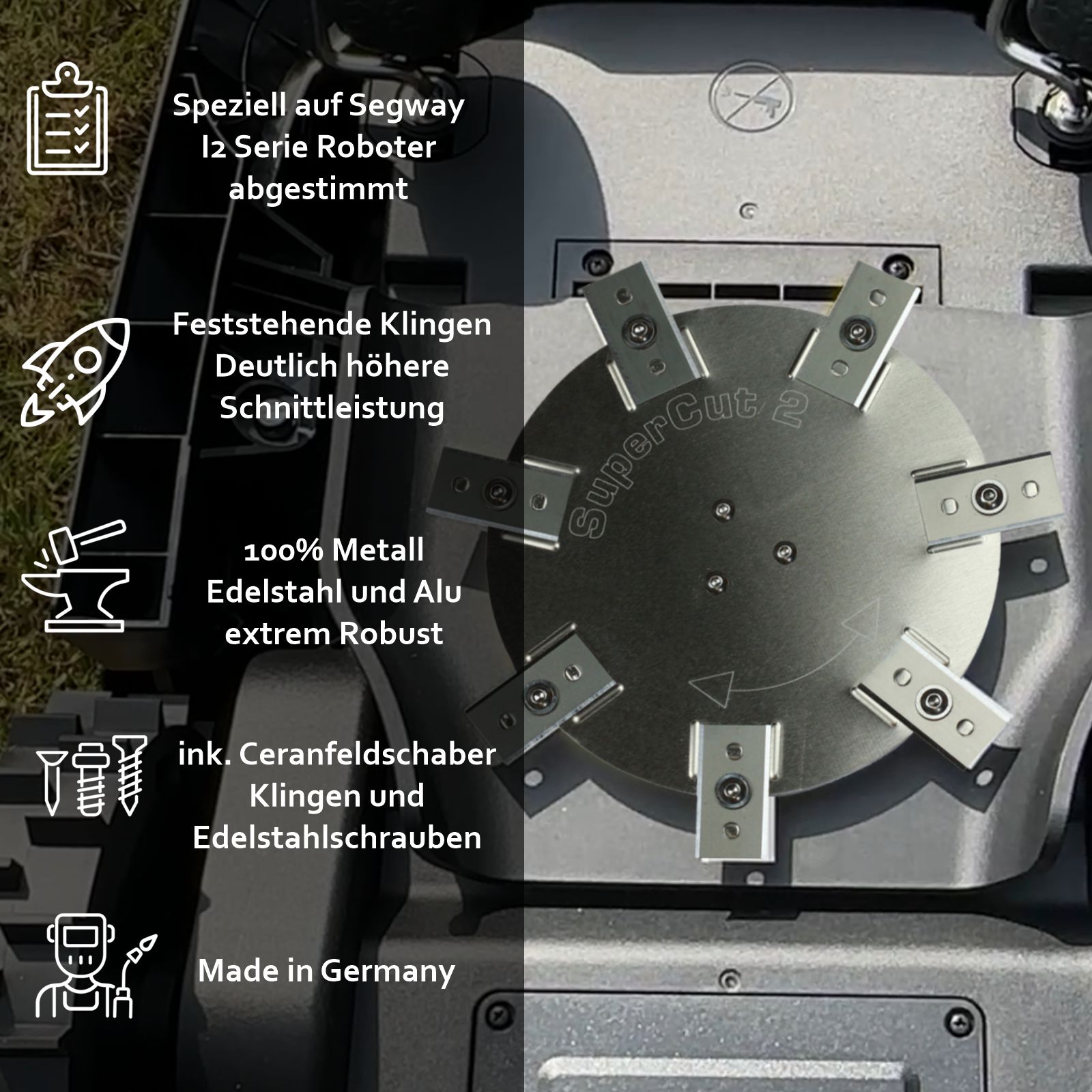 Messerteller aus Edelstahl und Aluminium für Segway Navimow i208, i210, i215 und i220 LiDAR . Erzielen Sie mit unserem Heavy Duty Messerteller für Ihren Segway Navimow Mähroboter ein sichtbar besseres Schnittergebnis. Dank der 7 feststehenden Klingen sorgen Sie für präzise Schnitte und einen gleichmäßigen, gepflegten Rasen. Besonders praktisch: Unser Messerteller ist speziell für die preiswerten, extrem scharfen und langlebigen Ersatzklingen für Ceranfeld-Schaber konzipiert – eine günstige Alternative zu herkömmlichen Klingen.