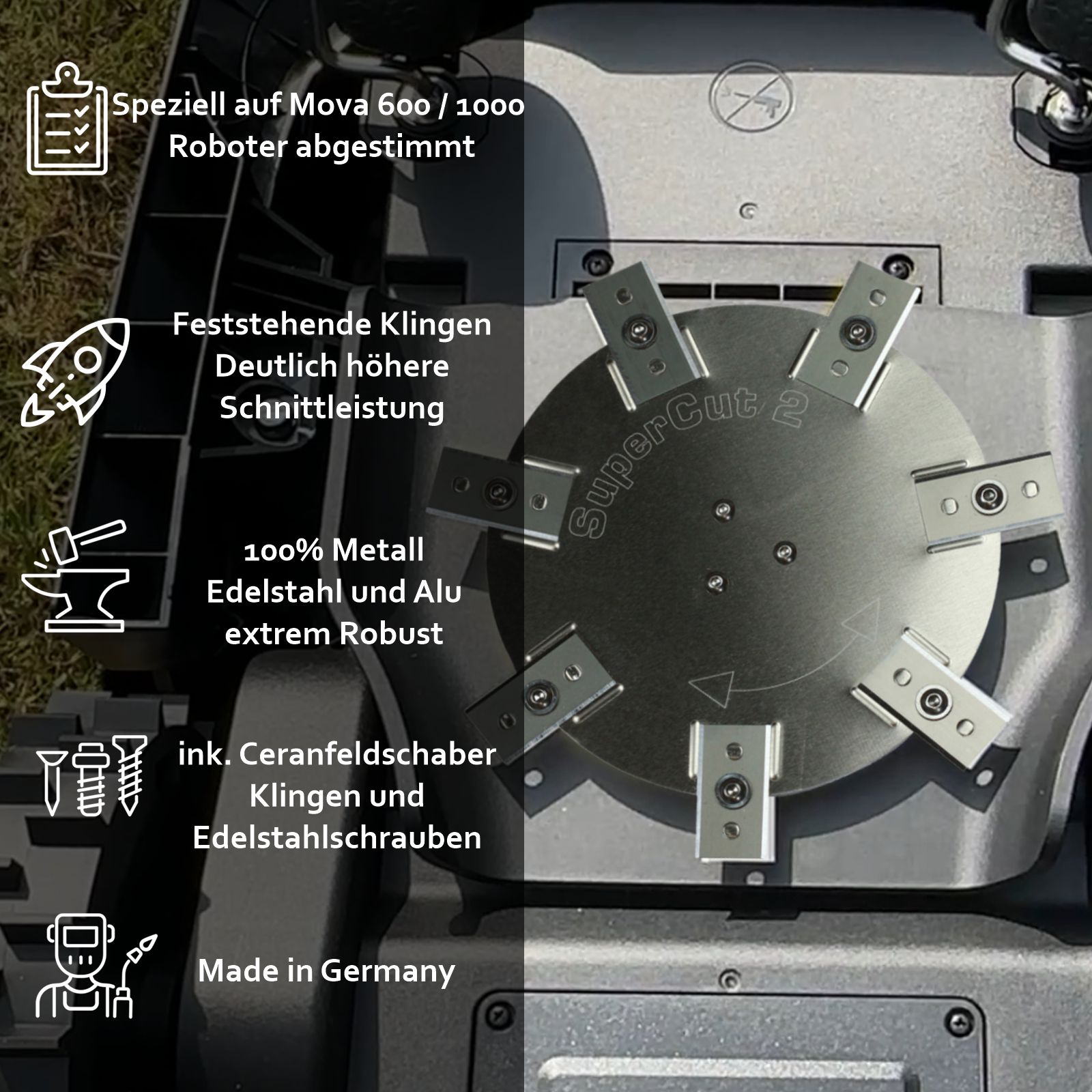 With our cutting disk for the Dreame Mova, you achieve visibly better cutting results thanks to the 7 C-blades. The precise cuts ensure an even and well-maintained lawn. Especially beneficial: our heavy-duty cutting disk is specifically designed for affordable, ultra-sharp, and long-lasting replacement blades made for ceramic hob scrapers.