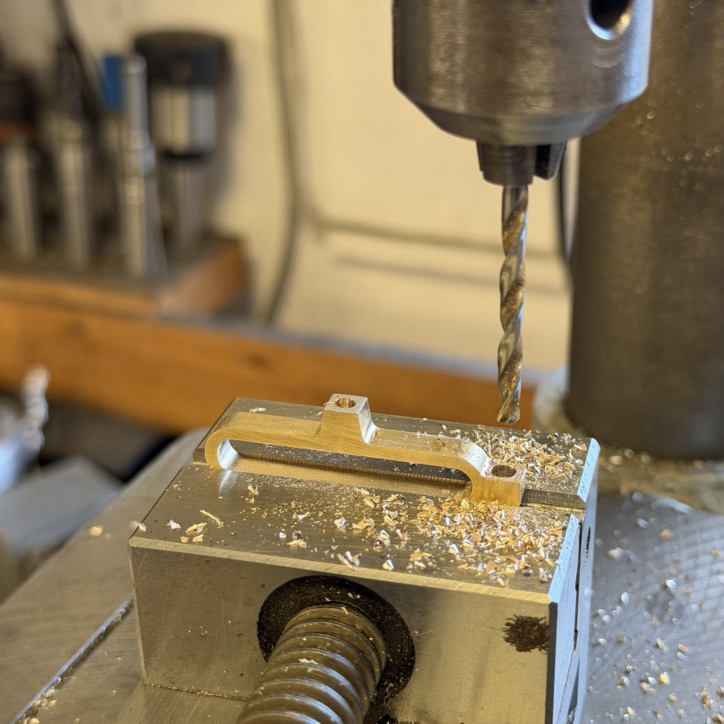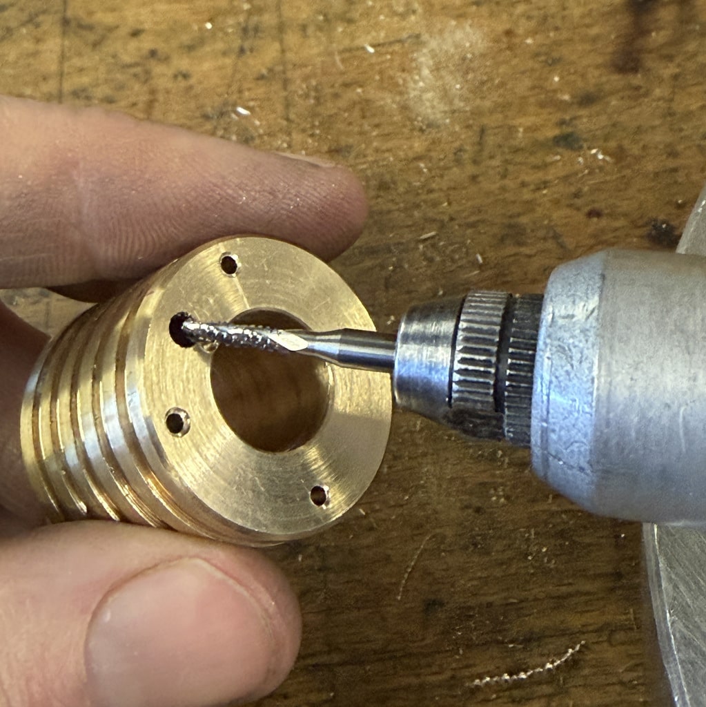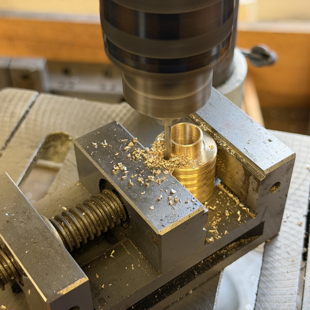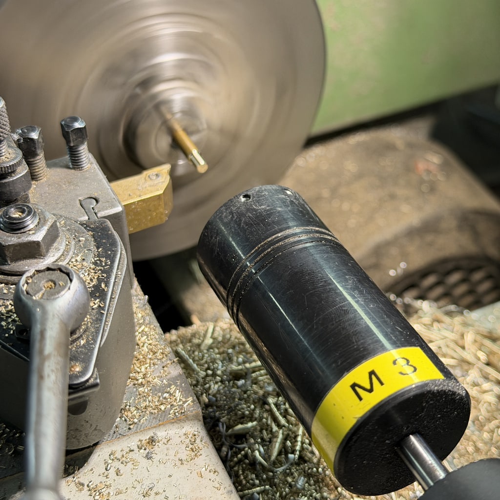 Ich beginne mit der Bohrung für den Arbeitskolben. Nachdem ich die Bohrung mit einem 10 mm Bohrer vorgebohrt habe drehe ich die Bohrung auf 12mm aus. Mit den Innendrehmeißeln geht das ganz hervorragend, wichtig ist hier nur die Oberfläche das genaue Maß ist hier nicht entscheidend. Wir können den Kolben an die Bohrung anpassen. Alternativ könnte man hier auch eine Reibahle 12H7 verwenden.