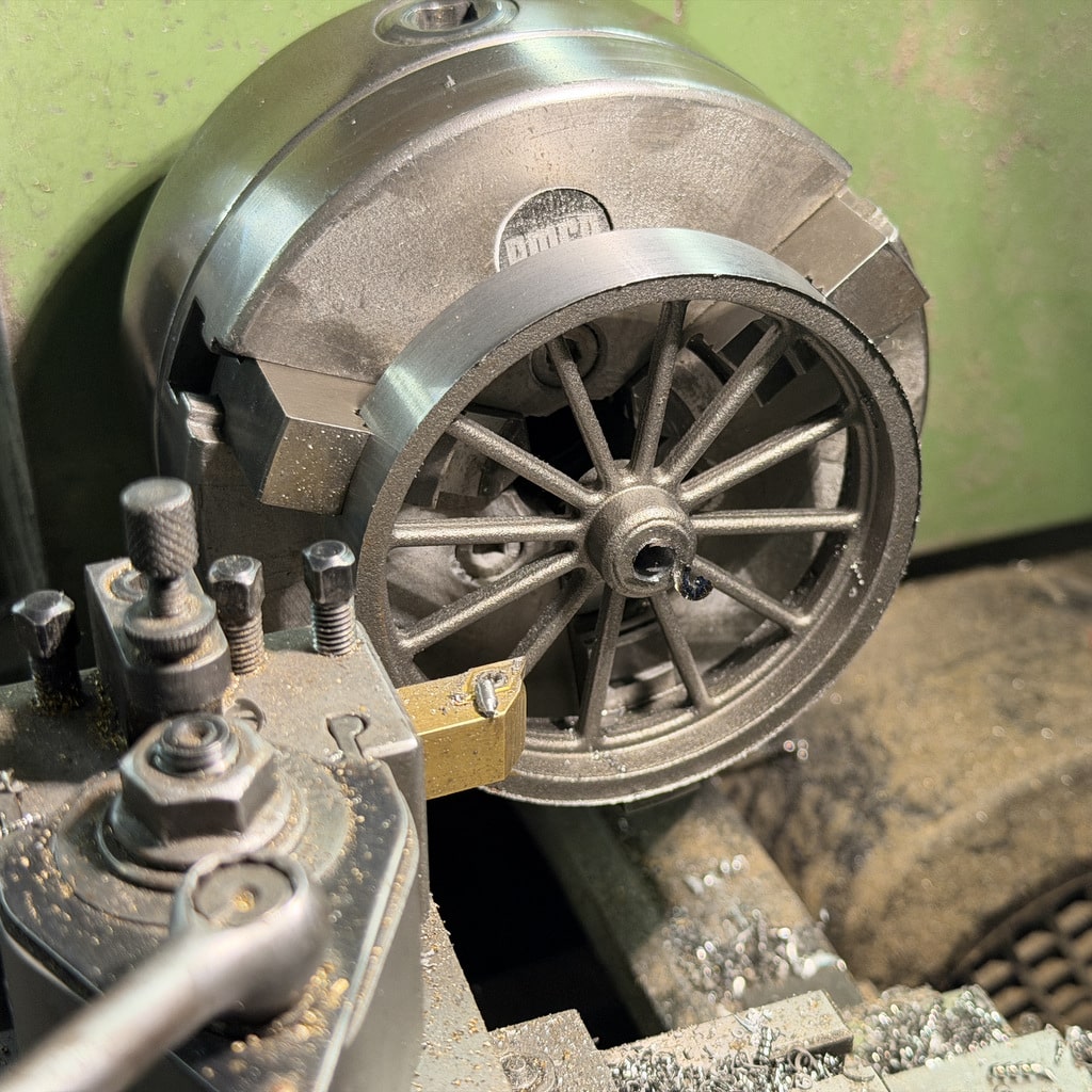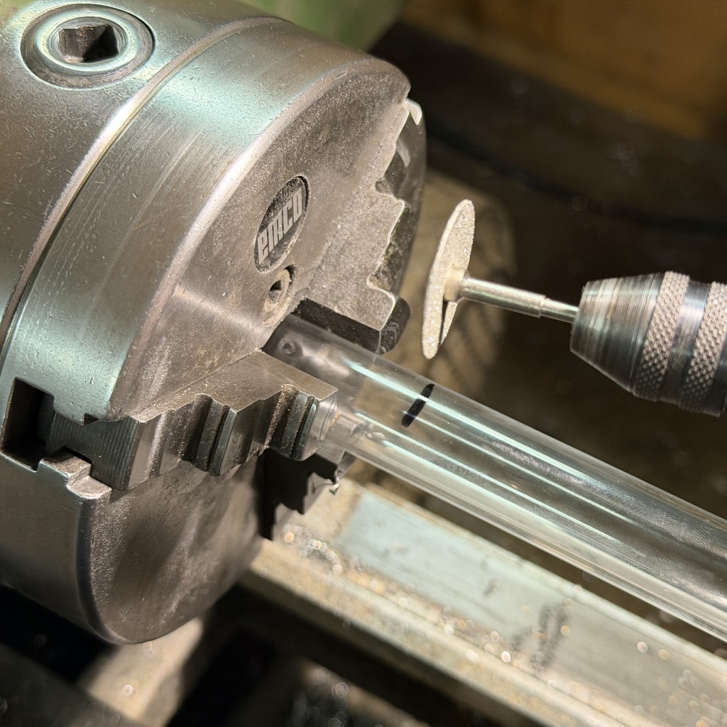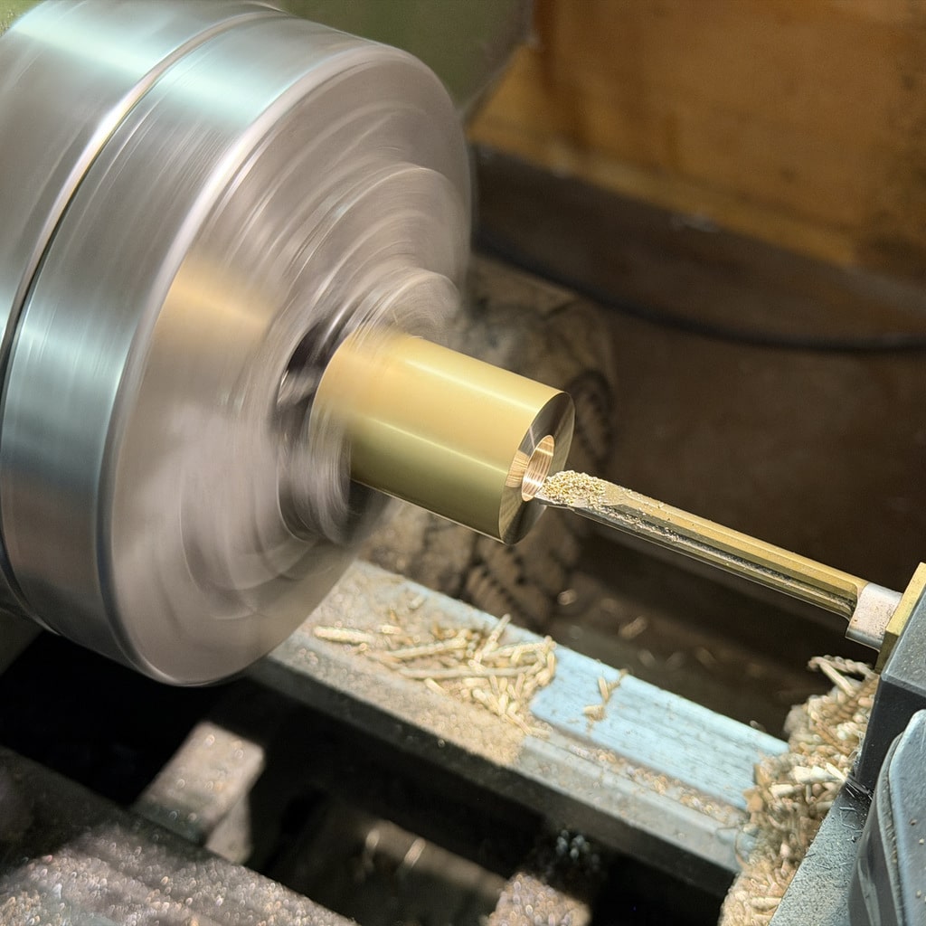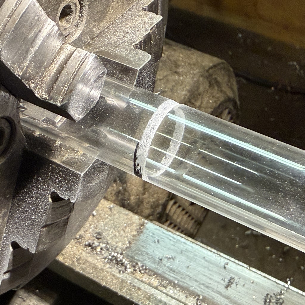 Ich beginne mit der Bohrung für den Arbeitskolben. Nachdem ich die Bohrung mit einem 10 mm Bohrer vorgebohrt habe drehe ich die Bohrung auf 12mm aus. Mit den Innendrehmeißeln geht das ganz hervorragend, wichtig ist hier nur die Oberfläche das genaue Maß ist hier nicht entscheidend. Wir können den Kolben an die Bohrung anpassen. Alternativ könnte man hier auch eine Reibahle 12H7 verwenden.