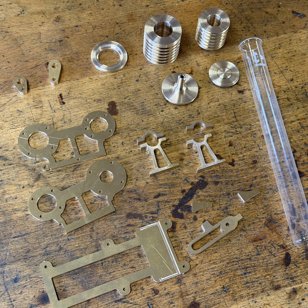Der Materialbausatz Laura 2 ist die konsequente Weiterentwicklung unseres Klassikers Stirlingmotor Laura aus dem Jahr 2007. Nachdem die ursprüngliche Konstruktion im Jahr 2025 bereits 18 Jahre alt wurde, haben wir uns dazu entschieden, den Motor konstruktiv zu überarbeiten und gezielt zu optimieren. In der ersten Version verfügte der Stirlingmotor über einen Arbeitskolben mit 10 mm Durchmesser sowie einen Verdrängerkolben mit 13 mm Durchmesser. Die neue Version ist nun mit einem 12 mm Arbeitskolben und einem 14 mm Verdrängerkolben ausgestattet. Zusätzlich wurde der Hub vergrößert, wodurch sich insgesamt ein um rund 70 % größeres Arbeitsvolumen ergibt.